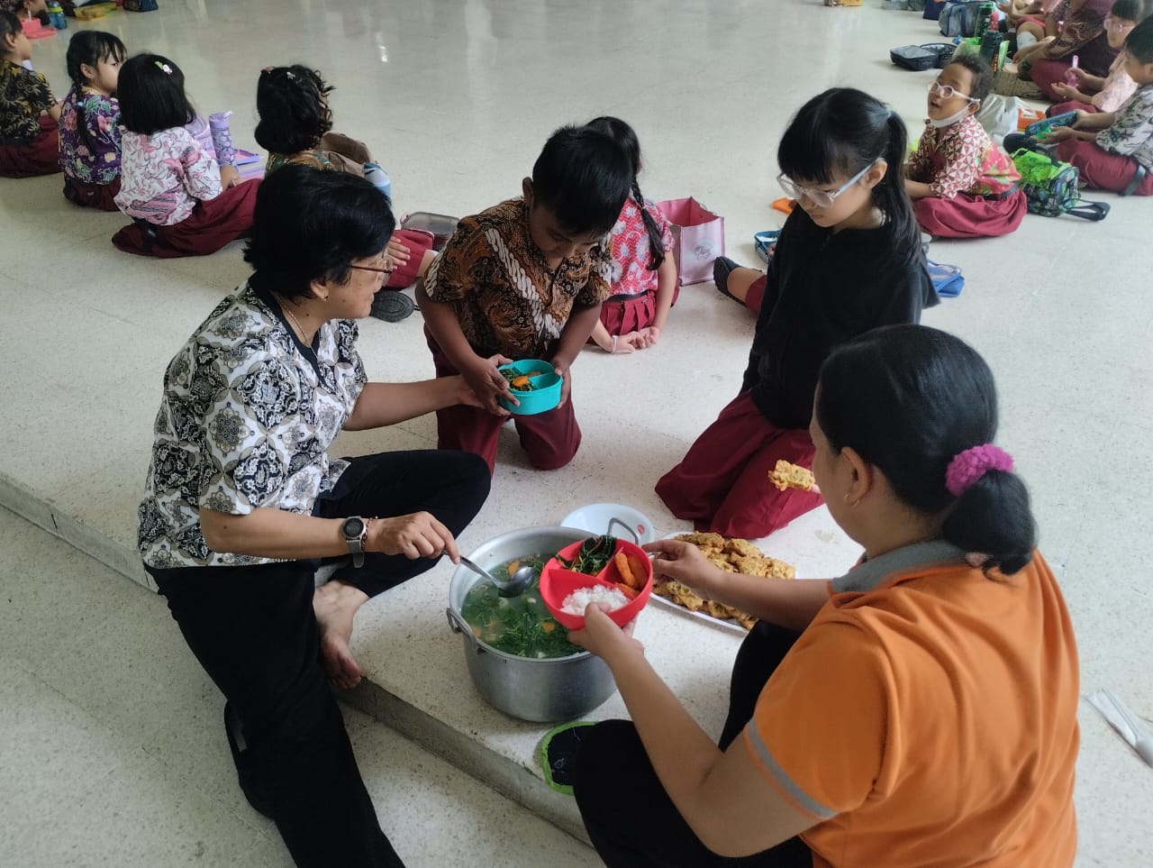 Guru-guru yang mendampingi pun tampak tersenyum bangga. Mereka melihat bahwa kegiatan makan bersama ini bukan sekadar rutinitas, tetapi ruang pembelajaran hidup — tempat di mana anak-anak mengenal arti kebersamaan yang sejati. Dalam tawa dan percakapan ringan itu, tumbuhlah bibit persahabatan dan rasa saling menghargai yang akan mereka bawa sepanjang perjalanan belajar di SD Santa Maria Ursulin.